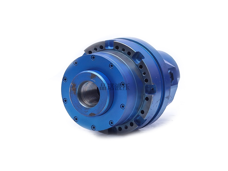 本产品是用于钻机设备中的一款新型液压马达,有孔和轴两种输出方式,中间孔通水,用于钻杆的冷却、清渣和排除瓦斯气体。它的特点是马达采用端面配油,用柱塞作为传力部位,故具有比同规格其他型号的马达能承受更大的工作压力,可以有更高的输出扭矩,更加符合用户的使用要求。