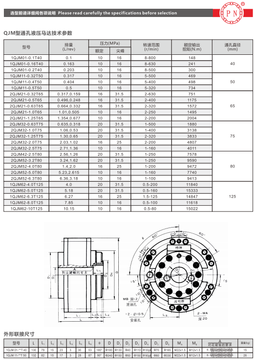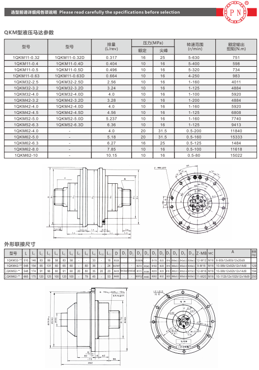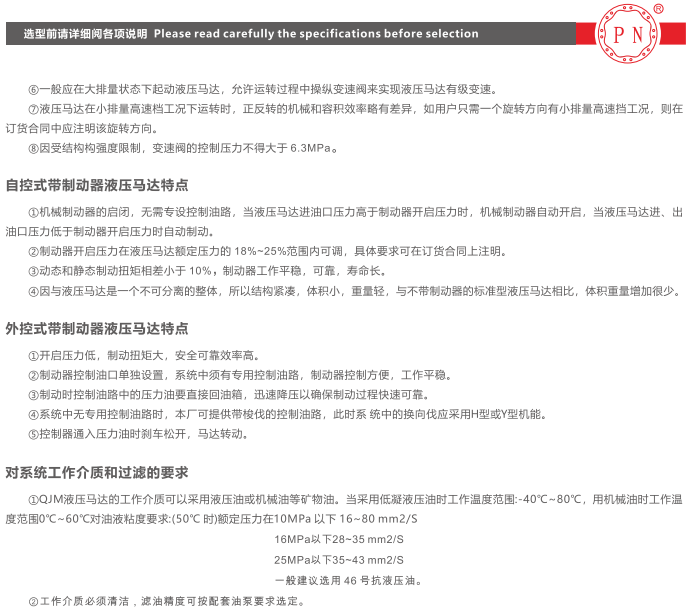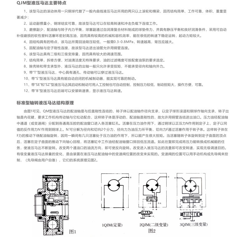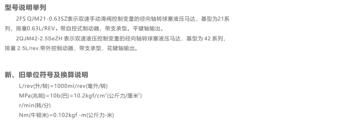 QJM型液压马达可与各种油系、阀及液压附件配套组成液压传动装置,由于它在设计上采取了各种措施,故可适应各种机器的工况。该型马达具有重量轻、体积小、调速范围大、可有级变量、机械制动器可自动启闭、低速稳定性能好、工作可靠、耐冲击、效率高、寿命长等一系列优点。目前已广泛应用于矿山建筑工程、起重运输、冶金重型、石油、煤矿、船舶、机床、轻工注塑、地质勘探等部门。可直接驱动履带行走、轨道轮子驱动、各种回转提升机构、勘探钻孔、带式输送、物料搅拌、路面切割、船舶推进、塑料预塑及非开挖等机构。